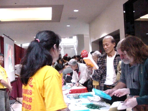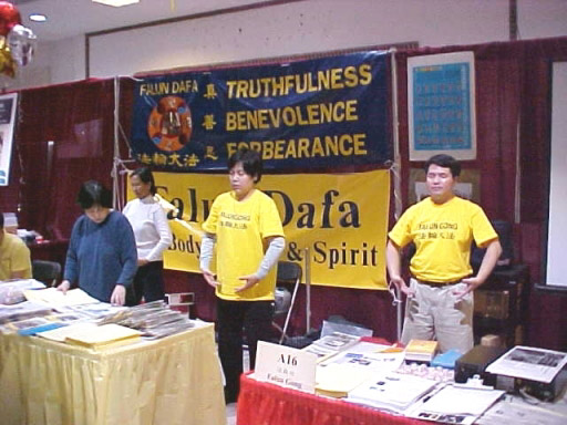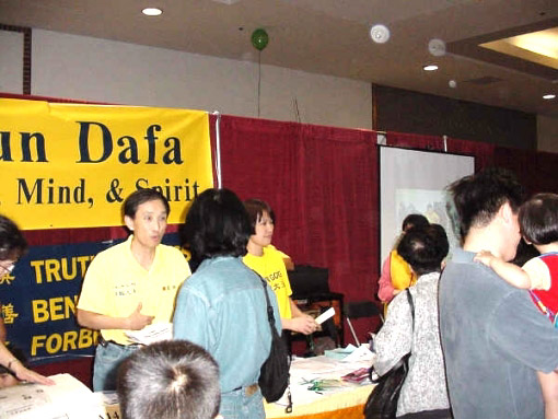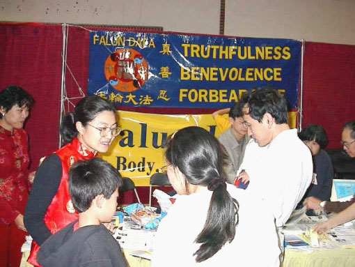 法轮功展台独家设置了投影电视,播放法轮功五套功法,并伴有法轮功学员现场炼功,优美的音乐和动作吸引众多游客伫立观看,不少人对法轮功产生浓厚的兴趣,纷纷上前询问如何学习,几千份中英文免费法轮功学习班传单、法轮功真相报纸等材料一扫而空。