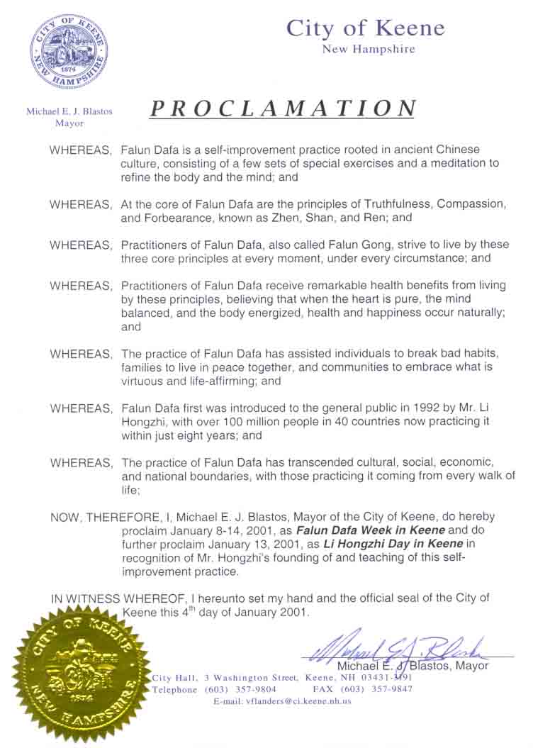 新罕布什尔州纳希瓦市市长褒奖法轮大法学员