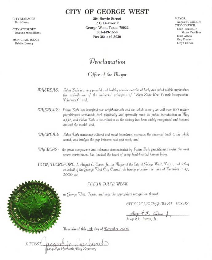 【明慧网2001年1月6日】 德克萨斯州西乔治市宣布2000年12月11日~17日为“法轮大法周”: