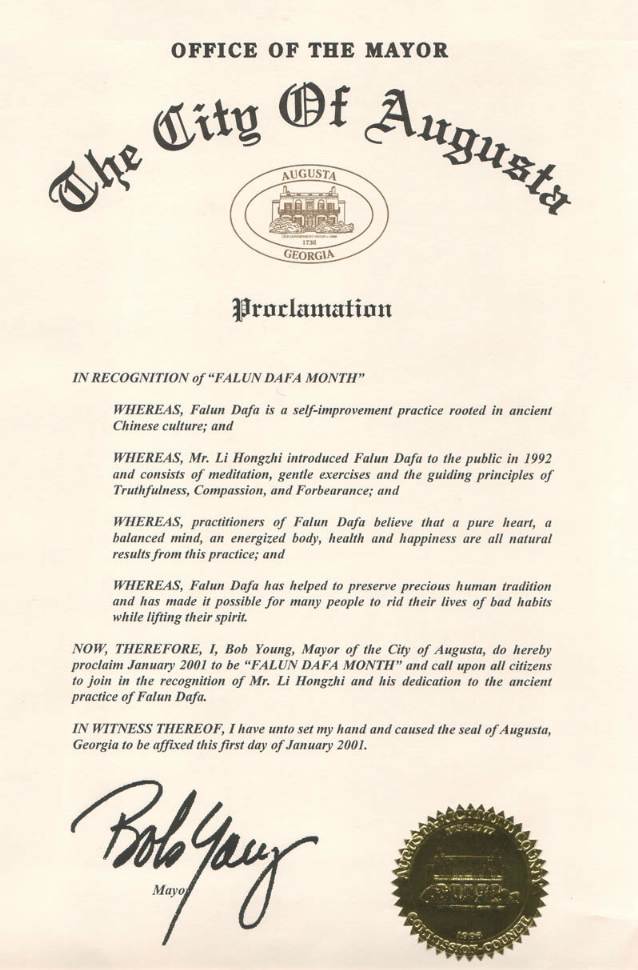 【明慧网2001年1月7日】佐治亚州奥古斯塔市宣布2001年1月为“法轮大法月”。