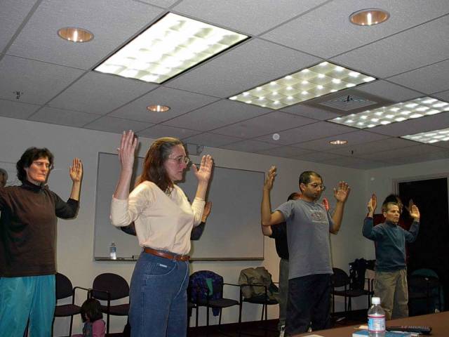 【明慧网2001年1月8日】 我们是俄勒冈州大法学员,为了跟上师父的正法进程,助师世间行,我们以不同的形式走出来证实法并向世人。我们利用每个周末在不同城市举办法轮大法讲座。在Corvallis市的一次洪法讲座中,一位五十多岁的美国妇女来到教功场所说她是一位太极练习者,她有一个儿子在中国四川工作,她们母子对中国的传统文化都很感兴趣,她的儿子在书信和电话中跟她谈了很多关于法轮功的事,而她在中国的儿子也无法帮她得到资料。她说她今天很幸运,终于在家门口见到法轮功了,并说一定要修炼法轮大法。临走时她问我们:你们能多给我一份资料吗?我要寄给在中国的儿子,虽然他身在中国但他得不到资料,我要马上告诉他我已经在美国找到法轮功了。我们真切地感到还有很多有缘人尚未得法,要做的洪法工作还有许多。此次的大法讲座及教功非常成功。大家学的很认真,并看了法轮功真相幻灯片。他们表示很想知道中国到底发生了什么。学员们给他们介绍了修炼法轮大法后自己及家庭发生的巨大变化。场面真诚而感人。有的人当场买了教功录像带。现在这个城市已建起了集体练功点。以下为此次洪法中拍到的照片。