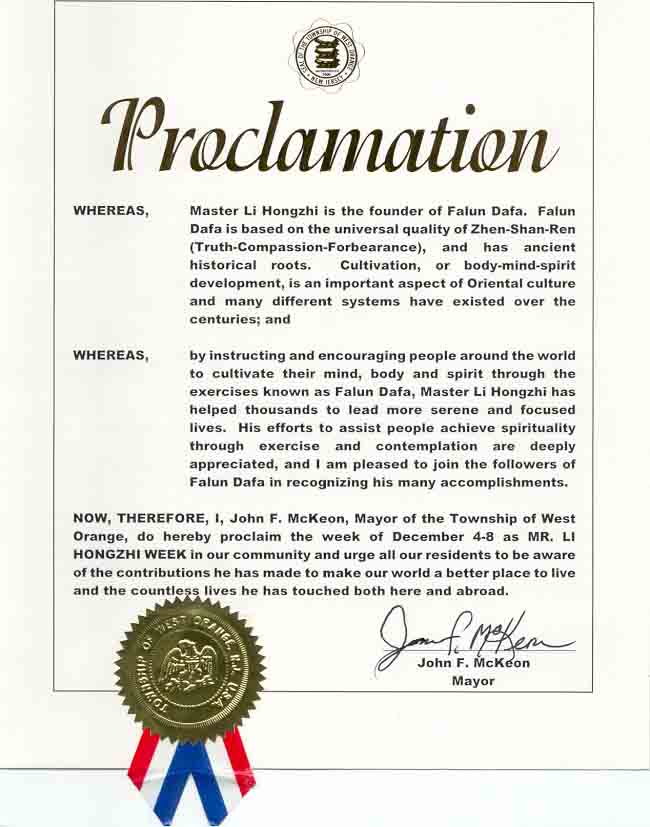 现在,我,John F. McKeon,西桔市市长,决定:宣布2000年12月4-8日为西桔市“李洪志先生周”,并号召全体市民共同认同他为把我们的世界变得更美好以及对国内外的无数人民的帮助所做出的贡献。