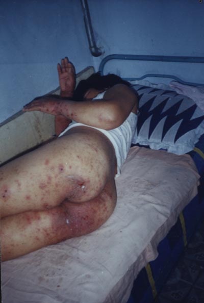 街道给家属施加压力,对外必须封锁消息,特别不让炼功人看,由于无处说理家里人只得忍气含冤给李梅丽准备后事。图为她放出来之后的照片,疥疮很严重。邪恶的万家劳教所只是中国大陆几千个邪恶劳教所的代表,李梅丽是千千万万个被江泽民犯罪集团迫害的法轮功修炼者之一。希望全世界所有有善念的人都来关注。