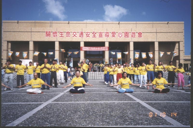 当天下午一时,约四、五十位宜兰县法轮大法学员组成了表演团队,队中年龄最小仅5岁,最年长者80岁,大家精神抖擞,秩序井然地入场。受限于时间关系,由六位学员演炼静功,其余学员同步演炼动功(如图)。