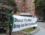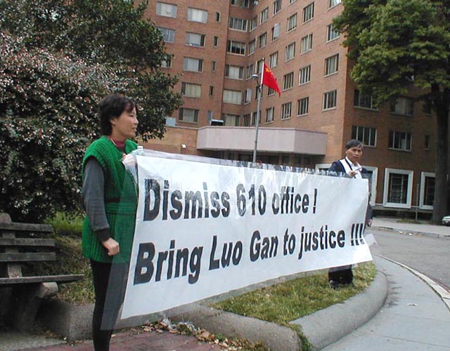 | 中国大使馆前召开紧急新闻发布会 | 小弟子的呼吁 | 弟子在会场外举着“解散610办公室,法办罗干!”的标语 |