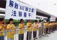 | 小弟子在中联办外发正念。 | 学员面对中联办正门发正念除恶,要求撤销610办公室及法办罗干。 | 10月1日上午, 20名学员、两条大横幅堂堂正正面对中联办请愿。 |