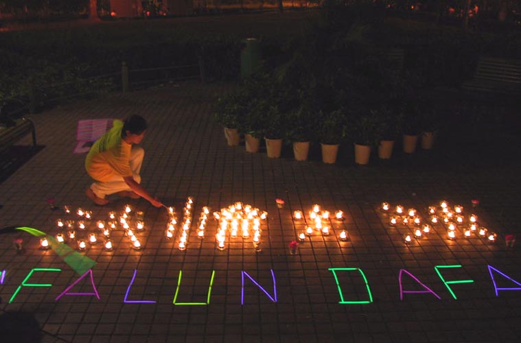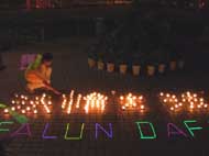 在民众群集赏月的公园里,学员用烛光与萤光棒洪法。
