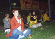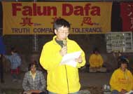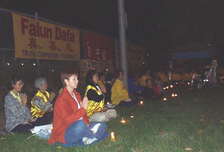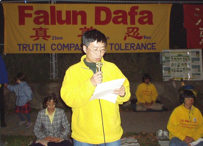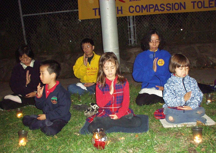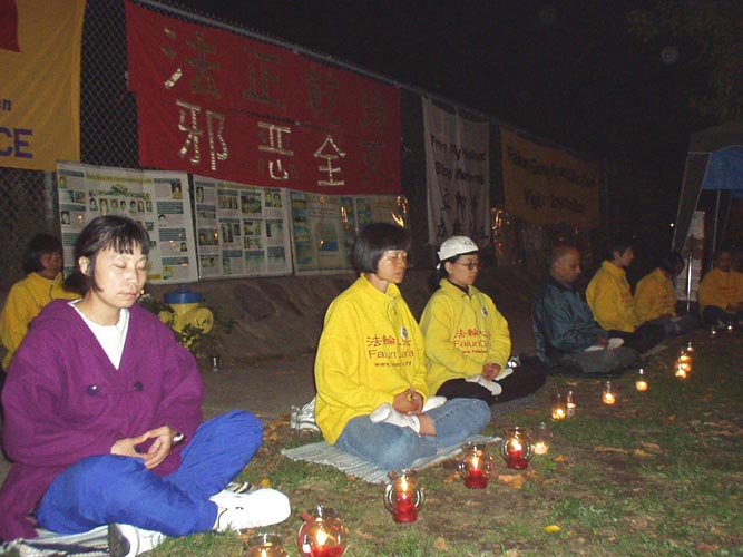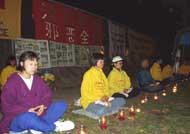 在炼过一遍动功后,学员们在静谧的烛光下,齐发正念除恶。然后,学员用中英文两种文字,先后向中国大使馆郑重宣读了《法轮功学员要求停止国家恐怖主义》声明,“辽宁省一法轮功女学员被警察自四楼窗户扔下活活摔死”,以及“加议员说中共镇压法轮功是国家恐怖主义”的新闻报道。声明指出:“迫害法轮功学员的一切行动都是江XX的指令,由中央、省、市各级“610”办公室执行。”“在过去两周里,法轮功修炼者在监禁期间被报道的死亡人数已超过20人。几乎所有的死亡都被诬陷为‘自杀’或‘自然原因’。”声明并呼吁下月出访中国的加拿大总理克瑞强“显现和平保卫者的本色,站在正义一边,代表加拿大人民发声,严厉谴责江泽民对法轮功学员实施国家恐怖主义。”