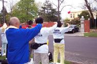 【明慧网2001年10月2日】9月30日清晨, 纽约大法弟子从明慧网上得知,辽宁一大法女弟子被警察打得奄奄一息后从楼上扔下摔死的消息后,便自发来到领事馆前抗议中国对善良法轮功学员的迫害。