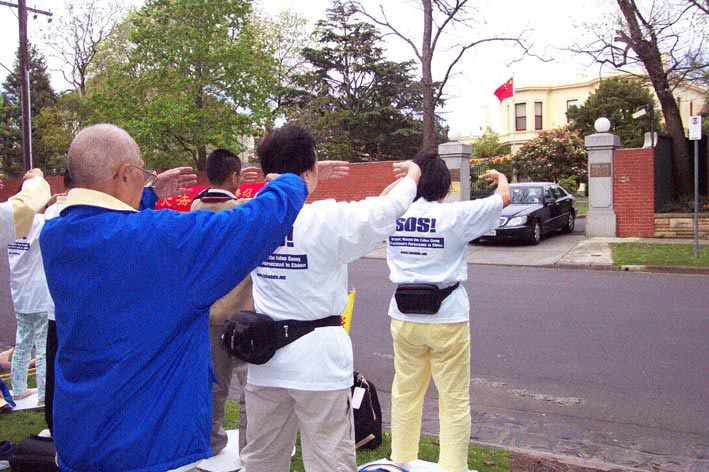 九月三十日(星期日),早晨七点前,两地的学员已来到了中国领事馆门前,在静静的马路边,对着中领馆的路对面人行道上八十八名学员坐在窄窄的空草地上,在三个整点时齐发正念。期间,学员们持续集体炼功。一切都在静静地进行,这里的清晨还依然宁静如初,只是从此过路的人们无不为此处无声胜有声的强大气势所震撼。一名早起的老妇人激动的说:“今天来了这么多的人,还这么安静”。在这期间领馆内的车子开进开出了好几次。这么多的好人,这么祥和的场,他们人的明白的一部份一定会有所感动。