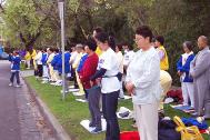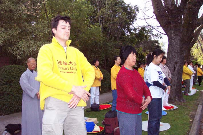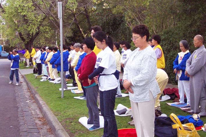 下午二点多钟,台湾学员从机场直接来到费兹罗(FITZROY)公园,他们经过长途的旅行没有休息,就以饱满的精神投入到洪法活动之中。他们一下车,就在公园前的大草坪上与墨尔本学员一道炼功,由于队伍的壮大,其气势吸引着许多游客驻足观看拍照。炼功完毕,学员们开始从公园步行至市中心商业区进行“SOS”步行活动,他们每人都手拿资料,在行进中向世人发送,他们的认真与真诚缩小了语言上的障碍,许多西人从他们手上高兴地拿到了大法的资料。下午,我们又一起赶到保克丘(BOXHILL),两地学员在那里举行一个经验交流座谈会。原订一间的房间已容不下如此众多的学员,只好再增加一间,学员们分成六组,大家围坐在一起争相讲述自己在修炼中的感受和体悟,直到晚上八点台湾学员才找住地休息。