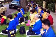 有一次,一群调皮的中学生路过这里。两个男孩子询问可否与静功盘坐的学员合影留念。征得同意后,他们就在旁边坐下了。学员们出定教他们盘腿,一个男孩居然可以双盘。虽然疼得直咧嘴,可还是笑着拍了一张照片。接过我们的报纸,他们高高兴兴地走了。