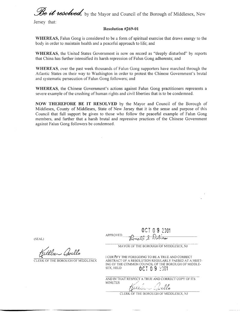 因此现由新泽西州密多塞克斯市市长及市议会通过决议,表明以下观点和意向:给予遵循法轮功成员和平典范的人们以全力支持,并谴责中国(江XX)政府对法轮功修炼者的残酷镇压。