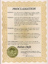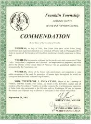 我,约瀚·克莱迪,新泽西州萨莫塞特郡富蓝克林市市长,代表市议会和富蓝克林市全体居民,在此褒奖这些前往华府行走了二百五十英里的法轮功修炼者及支持者,并且我们支持这样的主张:所有的人应被允许毫无畏惧的分享他们的信仰。