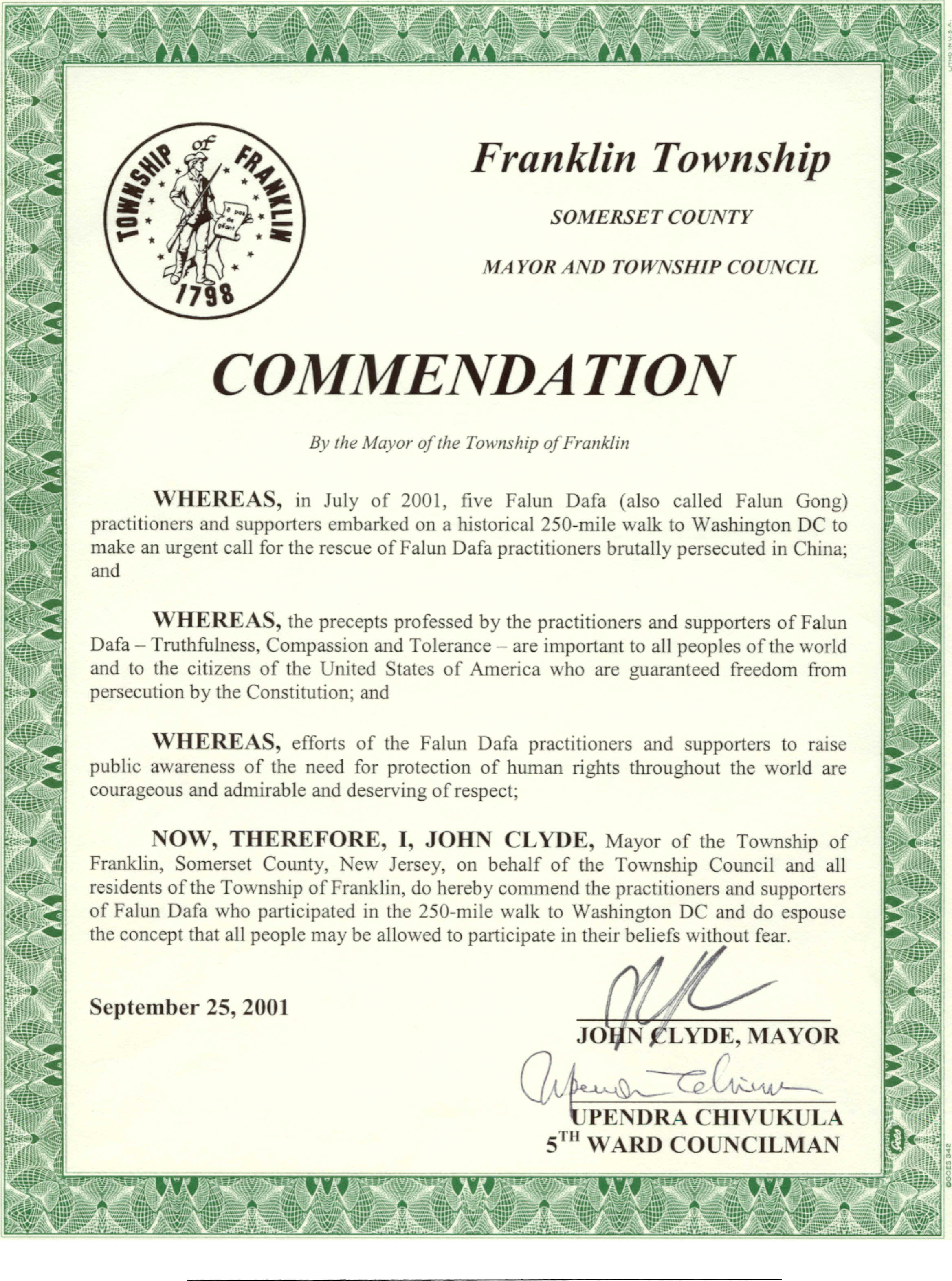 因此,现在,我,约瀚·克莱迪,新泽西州萨莫塞特郡富蓝克林市市长,代表市议会和富蓝克林市全体居民,在此褒奖这些前往华府行走了二百五十英里的法轮功修炼者及支持者,并且我们支持这样的主张:所有的人应被允许毫无畏惧的分享他们的信仰。