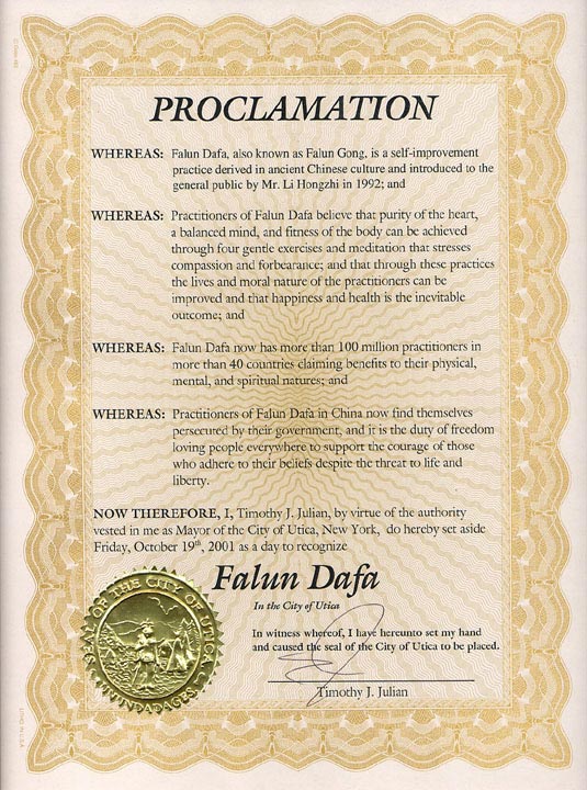 纽约州尤提卡市宣布“法轮大法日”