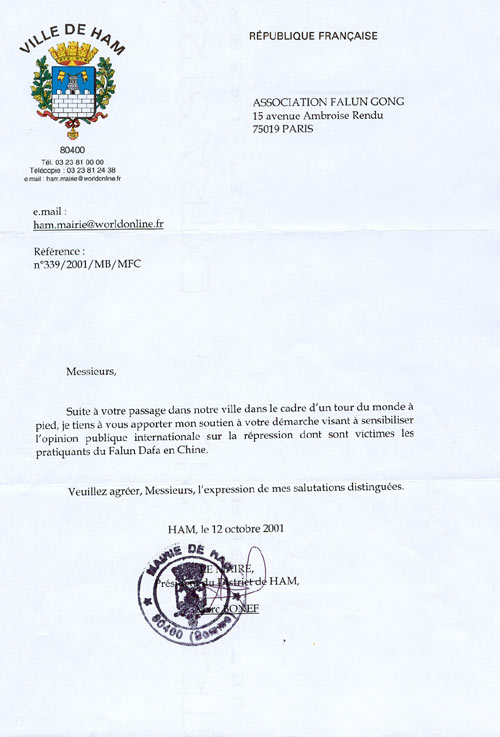 作为对你们环球步行经过我市的答复,我衷心支持你们为引起国际舆论关注中国镇压法轮功修炼者所做的努力。