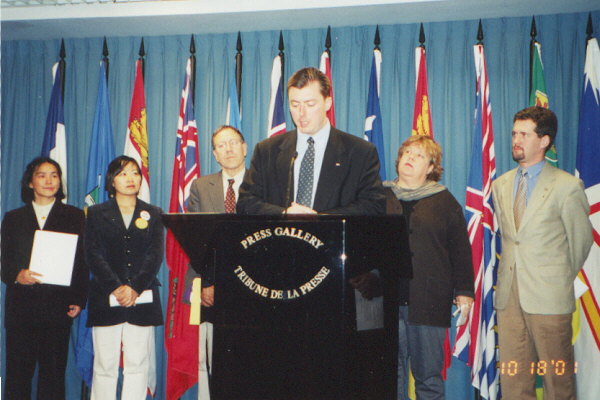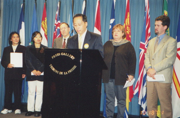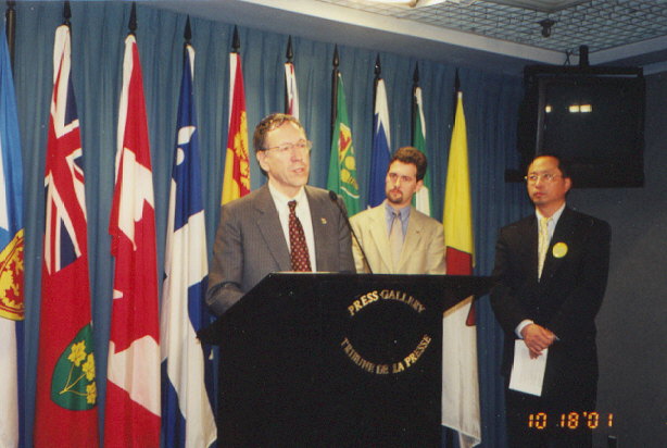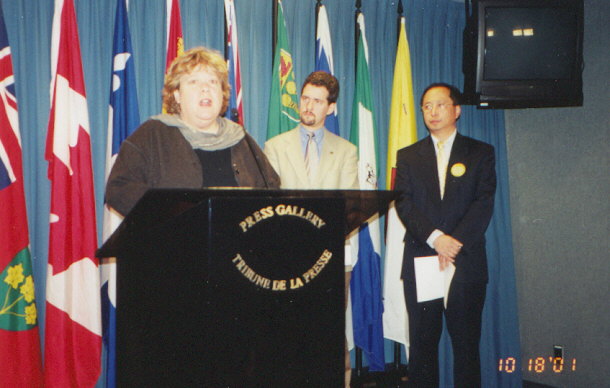 【明慧网2001年10月25日】在加拿大国会刚刚复会、最忙的时刻,四名国会议员挤出时间与法轮功联手举行新闻发表会,赞誉法轮功和平精神与坚韧不拔的精神,共同呼吁总理APEC访问上海时,要求江泽民停止法轮功。