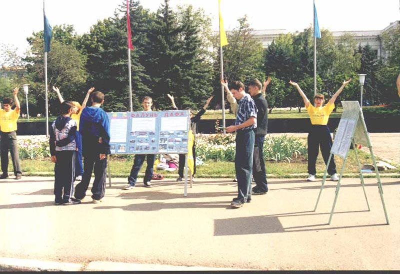 我们还向从刚刚到达的公共汽车里下来的乘客们发了报纸,然后我们伴随着音乐开始炼功,一个出租车开了过来,蛮有兴致地看我们炼功,还有一辆过路的轿车看见我们,掉头过来,把车停在我们对面,从车里出来一位妇女,走到展板前,问了几个问题,取了材料走了。