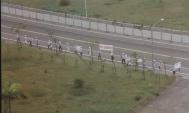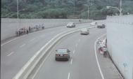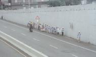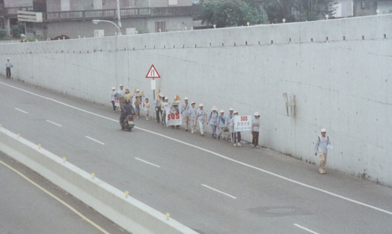 启程当天,晴空万里,天清体透,从国小一年级的小弟子到八十岁各年龄层共约40位学员,于上午八点齐发正念,一同踏上这次的正法之路。为了吸引来往车辆的注意,学员们分成两队,沿着公路左右两侧成一路纵队同时前进。学员深蓝色的披肩彩带、手上拿天安门前的恶警抓人、大法弟子赵昕受迫害等横幅及法轮大法和真善忍的三角旗确实引人注目,在普渡济世音乐引领下,平和地踏着庄严的脚步前行。
