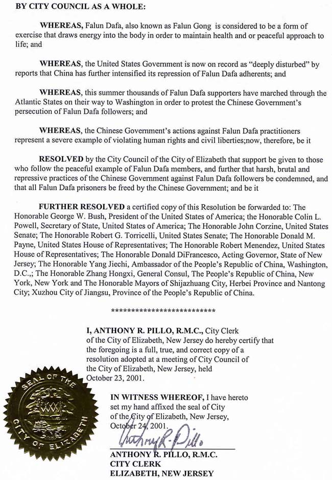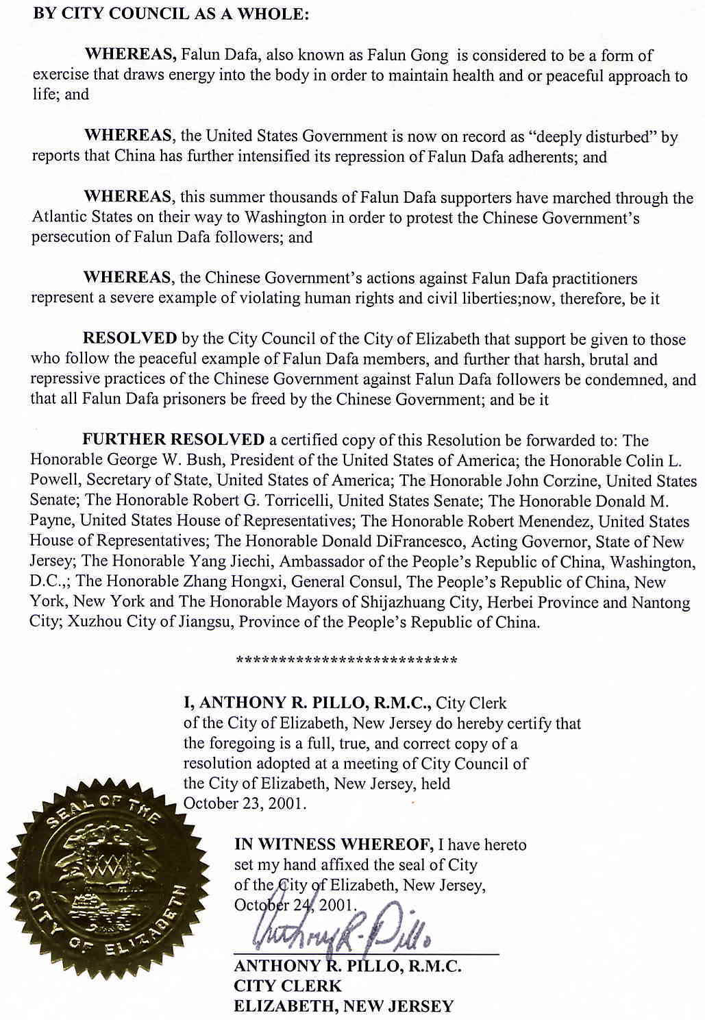 该决议由议长帕金丝-奥古诗特(Perkins-Auguste)女士发起。该决议认为:中国政府迫害法轮功学员的行为,是一种践踏人权和公民自由的残酷典型。市议会决定全力支持那些以平和的法轮功学员为榜样的人们,谴责中国政府对法轮功学员的残酷迫害和镇压,并呼吁中国政府释放所有被监禁的法轮功学员。同时还决定:将签发后的本决议文本送达美国总统George W. Bush,美国国务卿Colin L. Powell,新泽西州代理州长Donald DiFrancesco,代表伊丽莎白市的四位新泽西州籍的美国联邦参、众两院议员,中国驻美国大使杨洁褫,中国驻纽约总领事张宏喜,新泽西州爱迪生市的姐妹城市--河北省石家庄市市长,新泽西州泽西市的姐妹城市--江苏省南通市市长,和新泽西州纽瓦克市的姐妹城市--江苏省徐州市市长。
