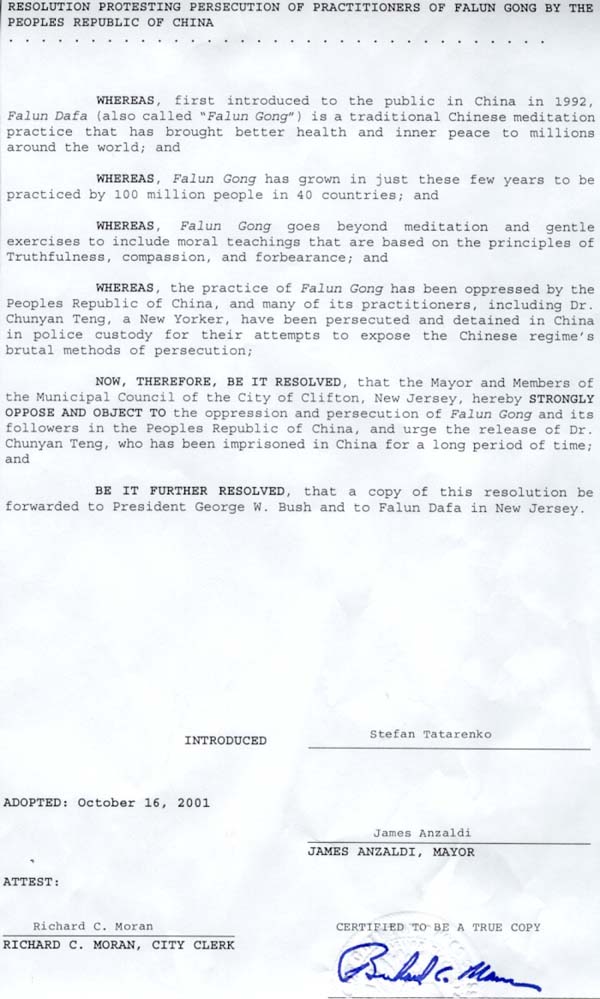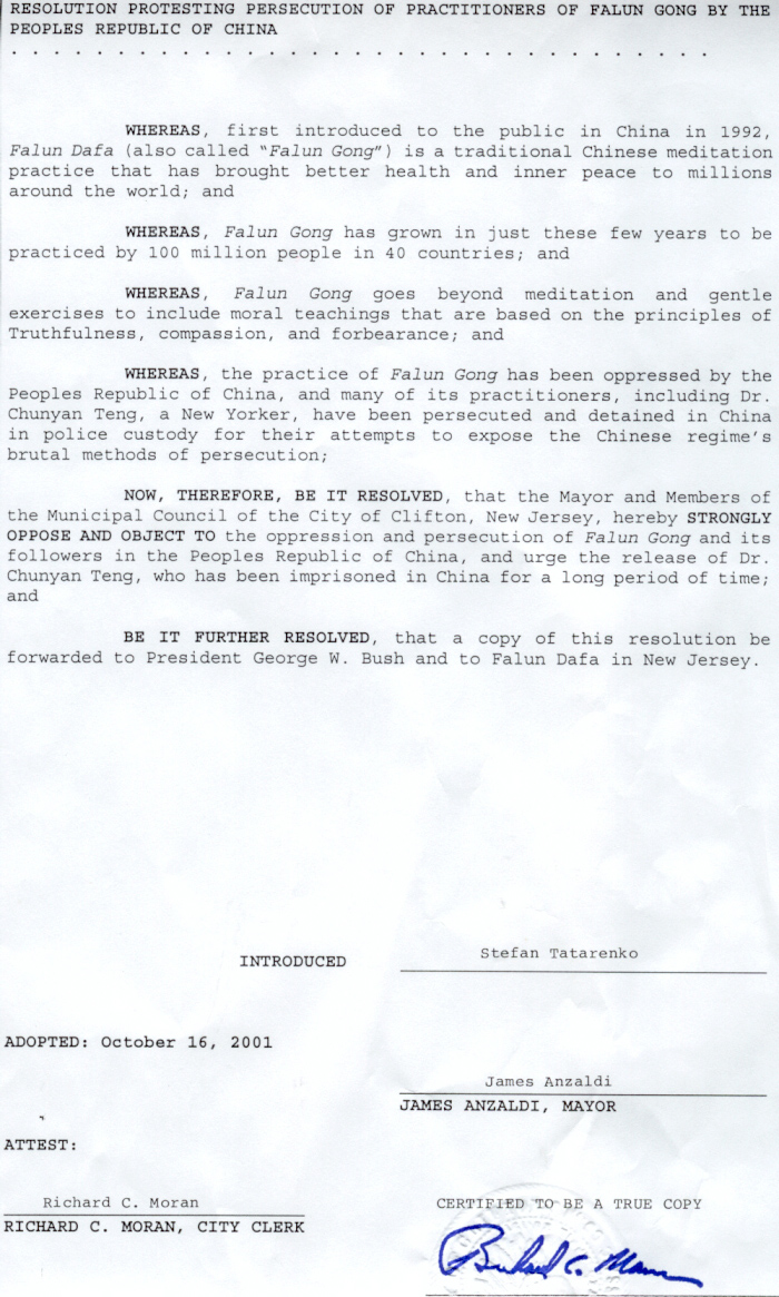 为此,新泽西州克里夫顿市市长和市议会强烈抗议和反对对法轮功及中国法轮功学员的镇压和迫害;呼吁释放已经被关押很长一段时间的滕春燕医生。