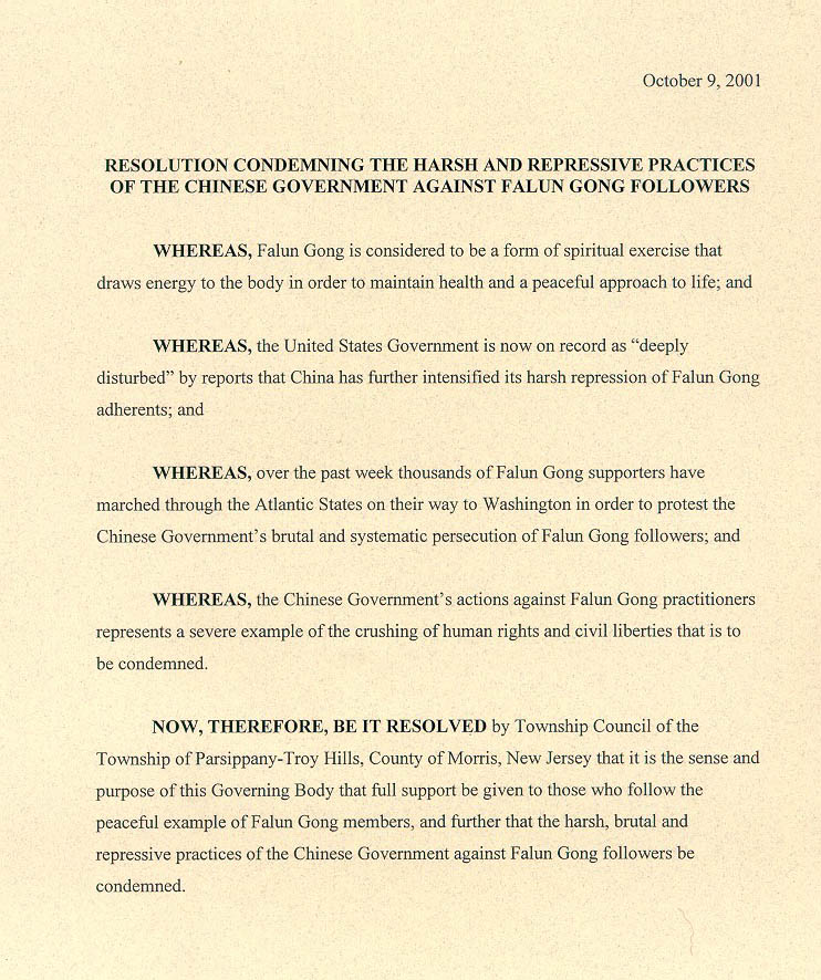 为此,新泽西州摩利丝县帕瑟伯尼--特拉利市议会决定:全力支持那些以平和的法轮功学员为榜样的人们,并且谴责中国政府对法轮功学员的残酷迫害和镇压。