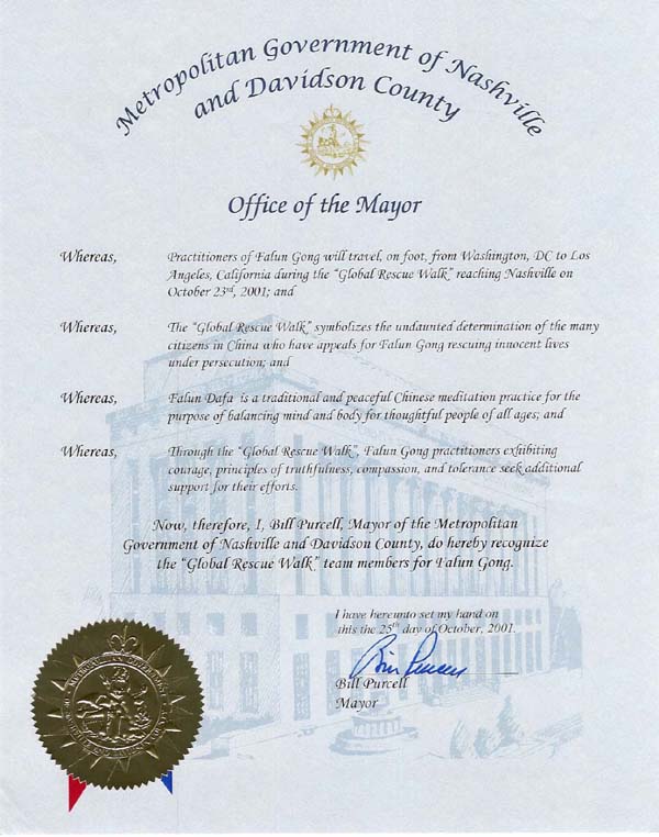作为大纳什维尔地区暨戴维森郡政府市长,我,比尔.泊塞,现在宣布褒奖法轮功“紧急救援全球步行”小组的全体成员。