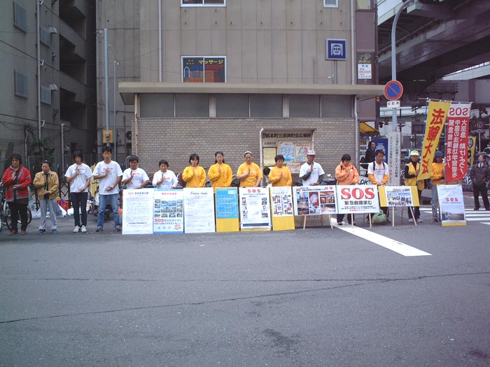 自从今年8月中旬第二次日本法会后,大阪有几个弟子坚持每天到领馆前请愿,向路人发报纸。10月18日上午九点半,SOS步行队伍举着“法轮大法”,“紧急救援在中国受迫害的法轮功学员”的旗子,沿国道公路走到中国驻大阪总领馆前,也参加了请愿活动,并在10点半召开了新闻发布会。首先,由日本学员宣读了给媒体的声明文,声明文中严正指出中国当局对法轮功的镇压是一种“国家恐怖主义”,呼吁全社会有正义感的人们帮助制止这种“恐怖”镇压。之后分别用中日文宣读了给领馆总领事王泰平的呼吁“停止镇压法轮功”的公开信。“日刊现代”报社到现场采访,并作了报导。