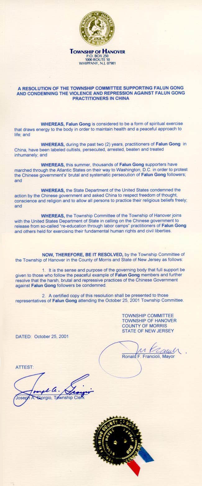 1、本议会全力支持那些以平和的法轮功学员为榜样的人们,并且谴责中国政府对法轮功学员的残酷迫害和镇压。