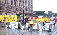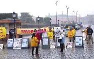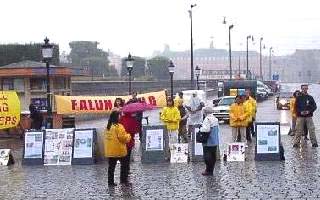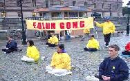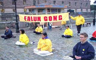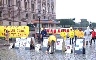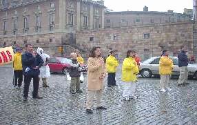 刚刚参加完在俄罗斯法会的20多位瑞典学员,一下飞机立即投入到瑞典“十一”的抗议活动和与此相关的新闻发布会。尽管天上下着雨,但我们的炼功和发正念的场面仍然吸引了许多人过往的行人。AP等媒体的记者前来对我们的和平抗议活动进行了采访。瑞典最大报纸“瑞典每日新闻”第二天对法轮功学员在中国被虐杀的事实进行了报导。
