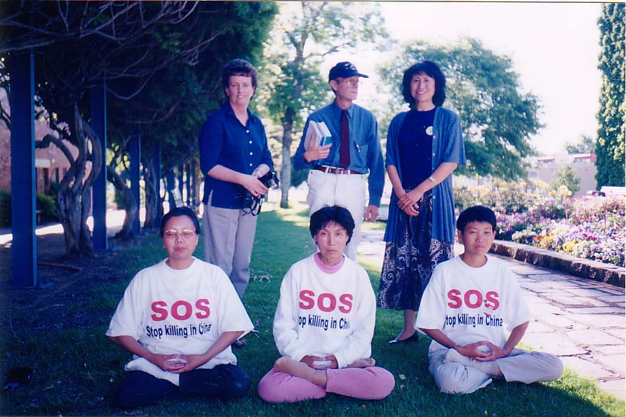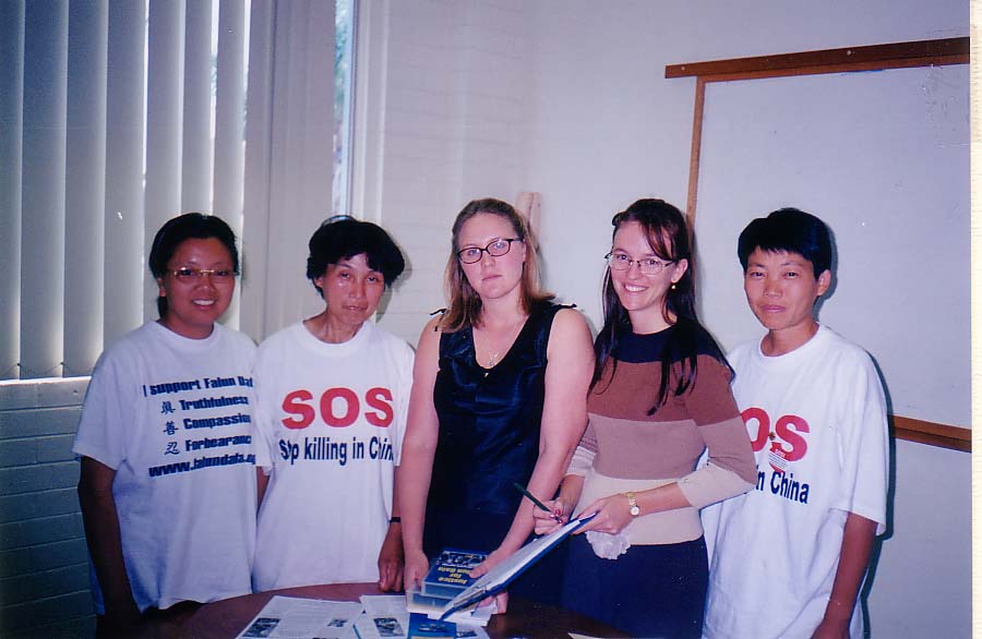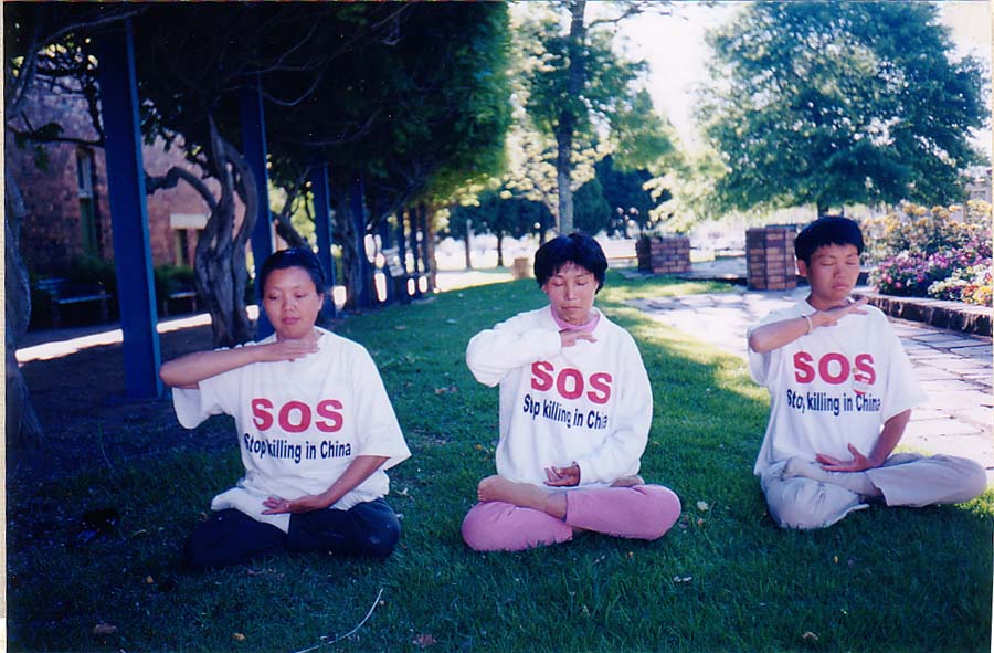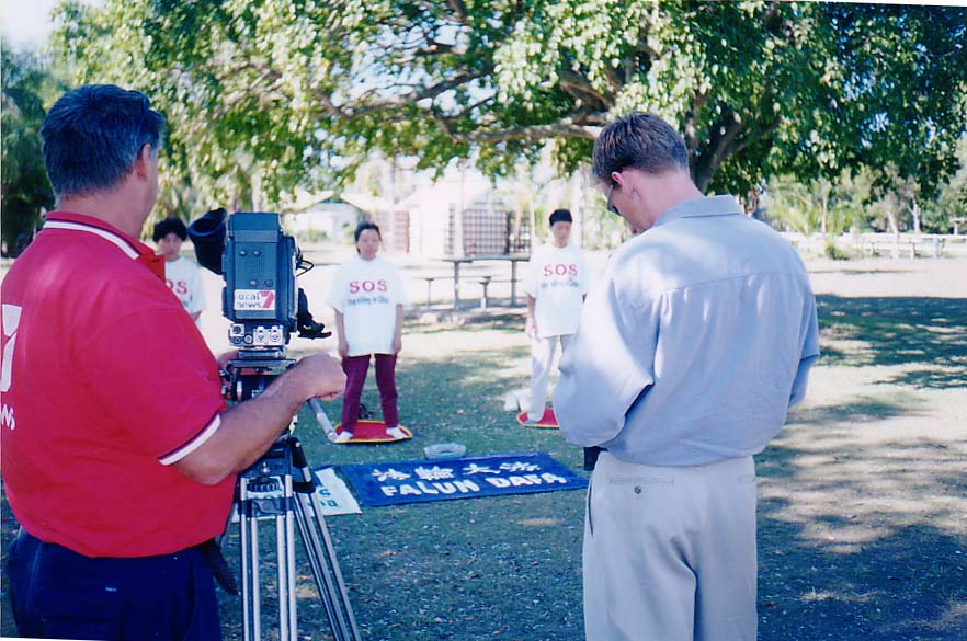| 环澳紧急救援的学员正在炼功洪法 | 10月22日,在昆省Toowoomba市接受地方报《THE CHRONICLE》采访 | 学员们与MARYBOROUGH 市市长交谈,市长签名以表支持 |