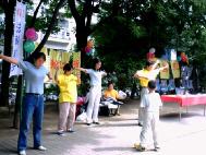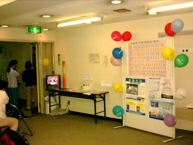 许多人驻足观看我们的录像带,彩色教功图片,及我们日本法轮功学员纵贯日本的SOS步行图片。几乎所有的来客问的第一个问题都是:中国为什么镇压法轮功?当我们告诉他们,因为江泽民将法轮功庞大的修炼人数当作对他们权力的威胁,而实际上是一种幻觉时,许多人表示了理解。当我们展示国内法轮功学员被残害的照片,许多参观者表现出了愤慨。更有一些,比如说本来受中国政府宣传对大法误解的一位阿姨,通过交流,明白了真相,表示要到炼功点来学。还有一位看过报纸的会场负责人走过来对我说,“我对中国当局撒谎非常厌恶,请到我们房间给每一人发一份报纸。”