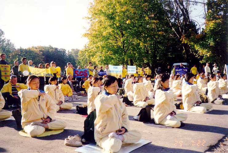 历时两天的法会,每天上午都在中国大使馆前面静坐抗议做为法会的一部分。几百大法弟子身穿印有《法轮大法》的黄色T恤,各种展板,标语牌《SOS—在中国》、《停止迫害》和贴有被迫害致死的学员照片的条幅,整齐排列。不同民族、不同国家、不同年龄的学员,几个小时肩并肩的在一起发正念、炼5套功法。现场庄严、肃穆,坚不可摧。