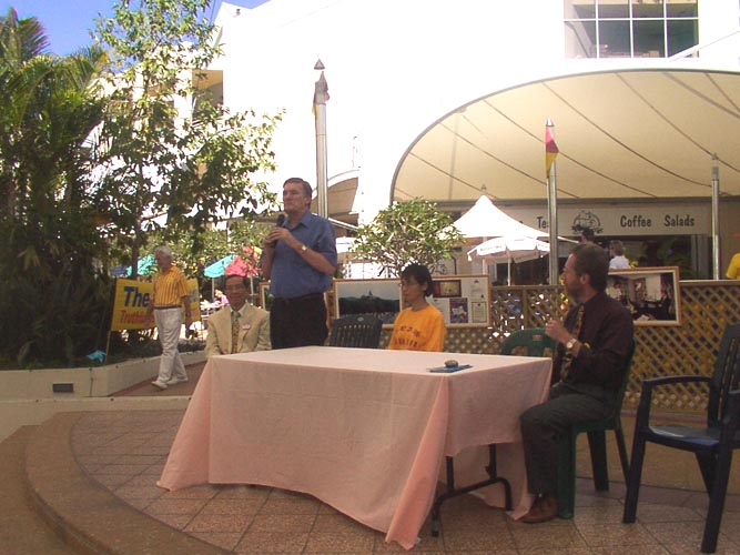 【明慧网】9月15日转发星洲报11日消息,为数约70名,分别来自马来西亚及新加坡的法轮功学员,在雨城太平湖公园的和平广场进行集体炼功。这里正在举行2001年和平之旅大游行,法轮功学员们在场发放有关法轮功发展史的光碟、精美扇子及宣传图文,十分引人注目。在接受记者提问时,法轮功学员说:他们初次来到雨城炼功及弘扬法轮大法的目的是追求和平真善忍,锻炼身体与净化心灵。