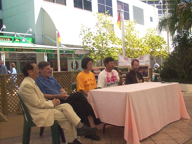 不一会儿;一位学员过来:“请你过去一下好吗?那里一位老先生一直追问同一个问题,怎么跟他讲都没用,好像是要来踢馆似的,我和另一位学员跟他谈了好一会儿了,拿他没办法。” 顺着她的手势缓缓走过去,轻松和缓的征得老先生同意后(老先生是在知道我是大法学员后才同意的),坐下来加入了他们的谈话,还没坐定,老先生劈头第一句话就是:“我知道法轮功很好,炼法轮功的人也都是好人,可是中共为什么还要打压?为什么还要抓人?是不是因为炼的人太多的缘故?”,虽然尽力向他说明并讲清一些真相,但老先生似乎有点抬杠似地一直在这个问题上打转,一下子,我看到了他的眼睛里泛着泪光,每当他问到:“中共为什么还要打压、还要抓人?”时,眼眶就红、就泛着泪水,我心里明白他是善良的,他是来倾诉,他是来寻求解开他心中百思不解的疑惑的,也或许是为他山东老家的亲友在担心着的。随着我的讲清真相,老先生提高音量:“既然全世界有那么多人都在炼法轮功,为什么只有中共要打压、要抓人?是不是因为炼的人太多了,给中共带来太大压力?还是因为法轮功有什么问题才让中共这样的?问题出在谁身上呢?”,“问题就出在中共本身上!”,我祥和但也十分坚定的回答:“伯伯,请您想想看,全世界有四十几个国家,一亿多人在炼法轮功,四十几个国家都说法轮功好,都欢迎法轮功,都喜欢他的人民修炼法轮功,都希望他的人民变好,为什么就单单只有中共怕法轮功?为什么就只有中共说法轮功不好?为什么就只有中共这样打压而且毫不讲理的虐待和迫害法轮功学员?伯伯,请您想一想,是怎么样的政府会这样子对待他的人民百姓的?是怎样的政府会害怕他国家里的好人太多的?伯伯,以您这样丰富的阅历一定比我更清楚,请您告诉我,问题是出在谁身上?”老人家低着头沉默了,我们就这样静静的一起沉默着。