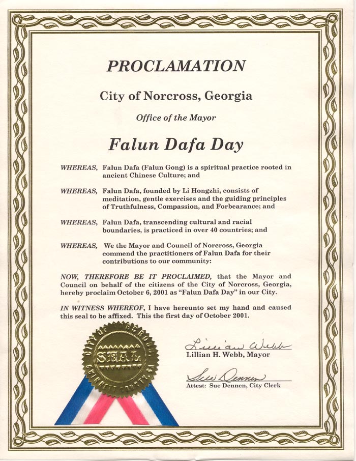 【明慧网2001年10月7日】乔治亚州诺克劳斯市市长Lillian H. Webb宣布2001年10月6日为“法轮大法日”。