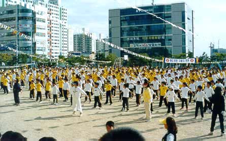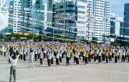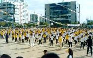 原来,养云小学教师玉贞兰是大法弟子,她向全校教师积极洪法,曾在教师节上向家长们教过法轮功第一套功法,当时普遍反映很好。因此,这次校体育部提议,由玉贞兰老师负责以炼三遍法轮功第一套功法作为本运动会的结束,校领导欣然采纳。这样伴着洪亮的大法炼功音乐,5、6年级与全校教师在运动场,4年级学生与家长们在看台上集体炼法轮功。结束后,无论是教师、学生、家长都一致叫好。家长们纷纷称赞学校在运动会安排炼法轮功,校方见反映如此好而感到十分高兴。
