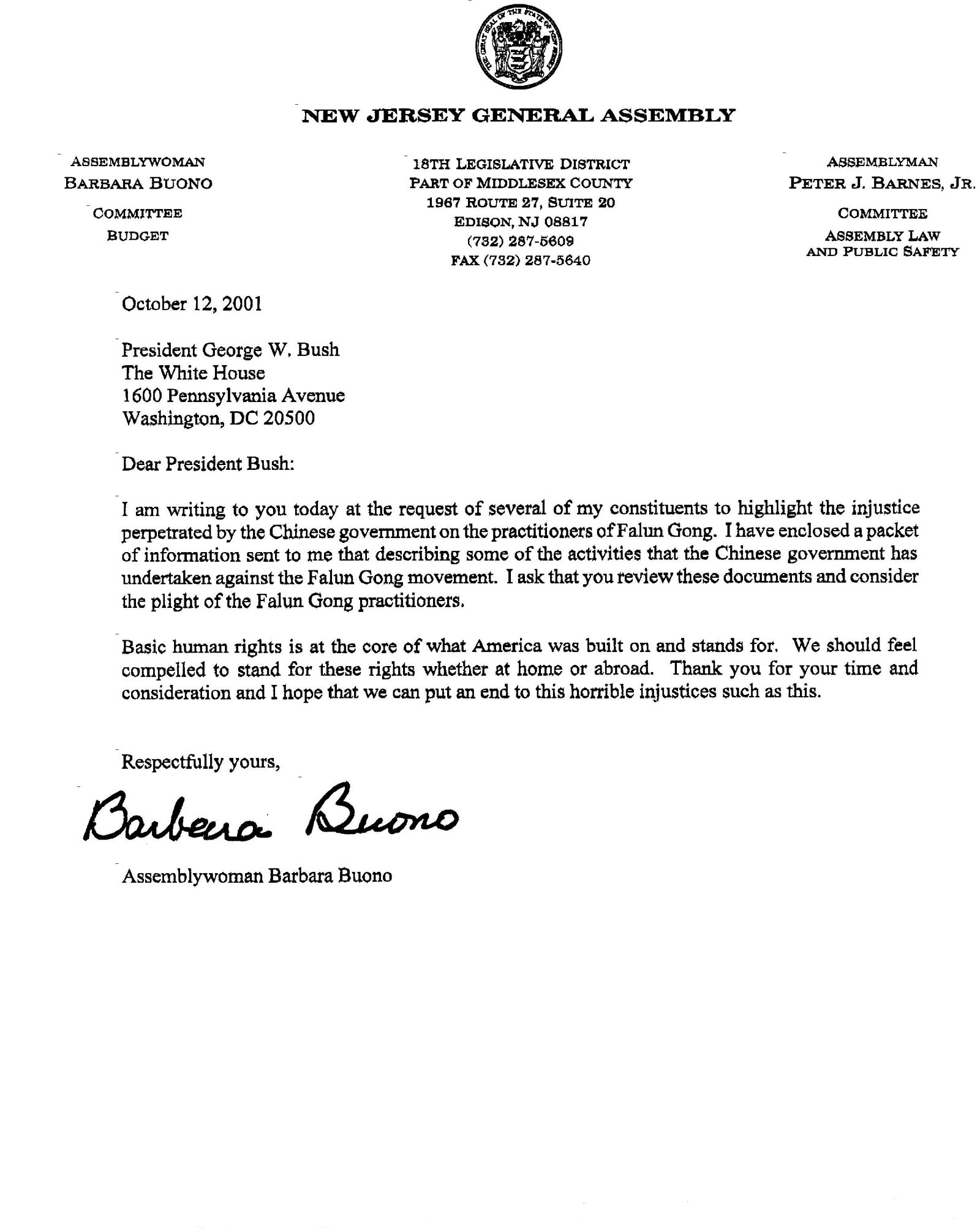 【明慧网2001年11月1日】在布什总统参加上海APEC会议前夕,新泽西州众议员波诺再次行使议员权利,致信督促美国总统布什关注中国对法轮功的镇压。这是近期她第二次写信表达对中国镇压法轮功的关注。今年8月波诺曾致信中国驻美大使和驻纽约总领事,诚恳地关注法轮功修炼者受到的迫害以及爱迪生市的中国姐妹市石家庄对法轮功学员的残酷迫害。