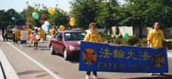 9月15日清晨,我们圣地亚哥大法弟子参加了圣地亚哥 POWAY 社区传统游行。弟子们早早就驱车来到了游行集合地点,用许多印有中英文“法轮大法”“真善忍”的七彩氢气球及标语横幅等将准备参加游行的汽车装饰一新。弟子们高举着中英文“法轮大法”“真善忍”的大型横幅,以及几面我们临时赶做的“制止邪恶”等标牌庄严肃穆地行进在彩球汽车前面。
