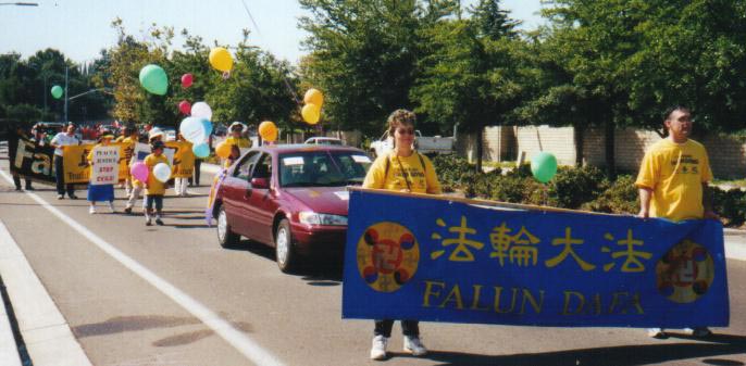 南加州九月的骄阳仍然灼热炙人,一位西人男弟子精神抖擞地提前来到游行出发点,而且不顾炎炎烈日,大汗淋漓,自告奋勇,独自在行进之中表演起五套功法来,稍后还恳请一位华人女弟子加入他。在缓缓前行的游行队伍中,这一男一女,一西一中大法弟子随着悠扬的法轮大法音乐炼功的场面引起了人们的极大兴趣,不少人情不自禁地跟着学了起来。