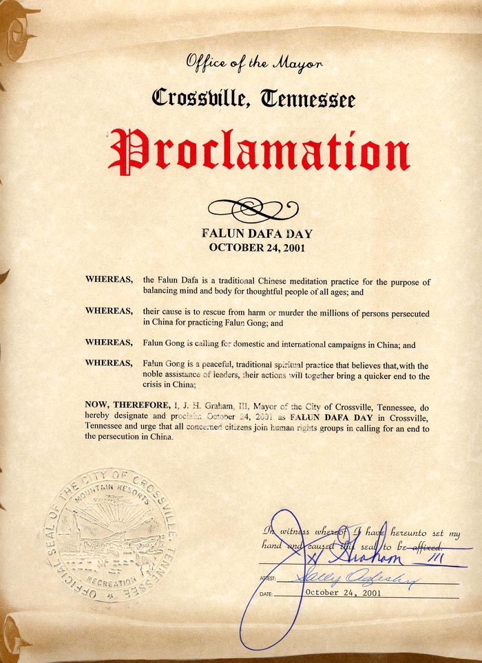 【明慧网2001年11月15日】田纳西州克罗斯维尔市(City of Crossville, Tennessee)宣布2001年10月24日为“法轮大法日”。