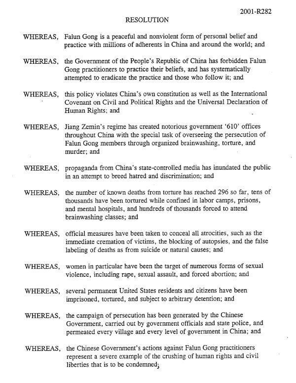 鉴于,法轮功是一个在中国和全世界拥有数百万追随者的和平、非暴力的个人信仰和身心修炼系统;并且,