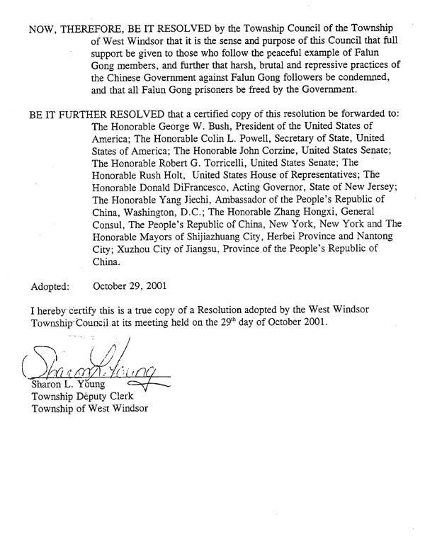 新泽西州西温莎市通过决议 强烈谴责中国迫害法轮功