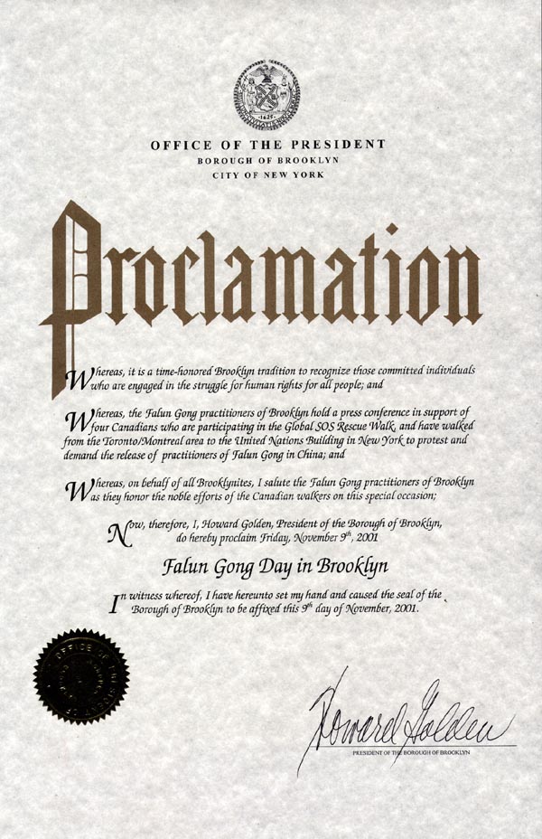鉴于,本区的法轮功学员借此活动向加拿大步行者的高尚行为表示敬意,我代表所有布碌仑区居民向布碌仑区的法轮功学员致敬;