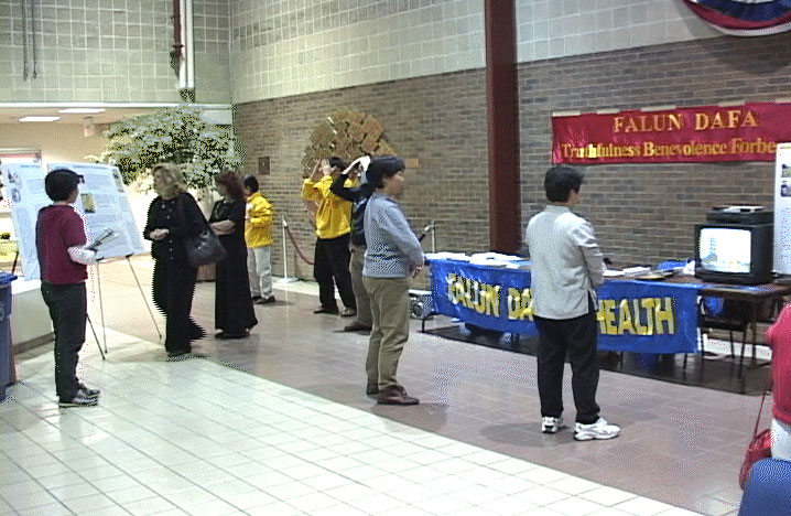 一位来自台湾的中年妇女原本是想到博览会找个按摩师替她治疗颈椎疼痛病,可是不知怎么搞的,她前面一位病人坐在按摩椅上就是不下来,她等得不耐烦了决定到别处看看,结果无意中发现了法轮功展位。于是就走过来问学员,炼法轮功是否能治好她的颈椎疼痛,学员告诉她只要真心修炼法轮功,别说是颈椎疼痛,再重的病也能炼好。她听后半信半疑,但还是决定来碰碰运气。于是便问学员能否教她,多少钱教一次,当听学员说可以当场免费教功时,她喜出望外,立即兴致勃勃跟学员学起功来。没想到第一套功法还没学完她的颈椎疼痛已好了一大半,法轮功的神奇效果使她惊喜万分。她花了一个多小时认真地学完了全部五套功法。后来她见摊位上的电视正在放李老师的教功录像,她又认真地跟着录像做了一遍,这才依依不舍的离开。