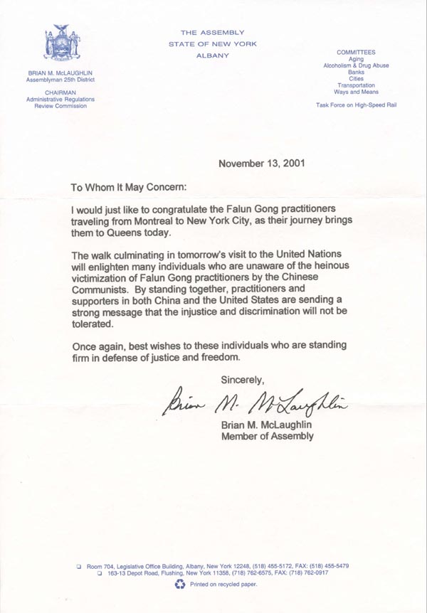 我写此信表示赞赏和钦佩你们对人权的付出以及你们坚定不移地用一切你们能做到的和平方式来停止你们的同修在中华人民共和国所遭受到的迫害。中国当局一再拒绝承认法轮功修炼者及其他许多寻求信仰和政治自由的人士的基本人权是绝不能被遗忘的。目前有一个危险,就是我们强调在其他问题如九月十一日恐怖谋杀问题上合作将导致中国当局以为美国人民不再关心人权问题了。你们的长途步行是一个非常重要的证明,不会是这种情形。而且作为一名美国国会议员,我欢迎这一机会用来表示我对步行的支持,因为我钦佩那些参加步行的学员,同时也因为我希望中国当局将注意到我和其他许多美国国会议员会继续对他们漠视基本人权的严厉谴责。