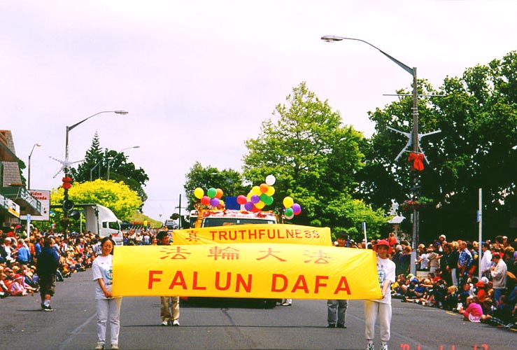 虽然天气预报说当天有小雨,但是游行开始时,天一下子晴朗起来,以太阳为中心有一个巨大的彩色光环出现在天空。我们的花车上蓝色的《转法轮》在粉红色的莲花座上显得格外醒目,圣洁的莲花配上学员舒缓,柔美的动作将法轮功的五套功法展示给观众。在我们的花车最前面是:“法轮大法”,“真善忍”,两条大横幅,后面是两排学员打着“真善忍”的小旗,路边的观众不断地向我们招手,还有很多孩子好奇地问他们父母什么是法轮大法,坐在莲花上的是不是花仙子,我们的游行队伍走过一个拐弯处后就进入了主道,一眼望去,两边的观众把道路围得水泄不通,当我们的花车出现时,人群中发出了赞叹声,每个人都被大法震撼了,很多观众不约而同地为我们鼓掌,还有几个当地人边跟著我们的花车走,边问,“什么是法轮大法”,当得知是一套真正的中国气功时,说“我们十分感兴趣,她太美了。”