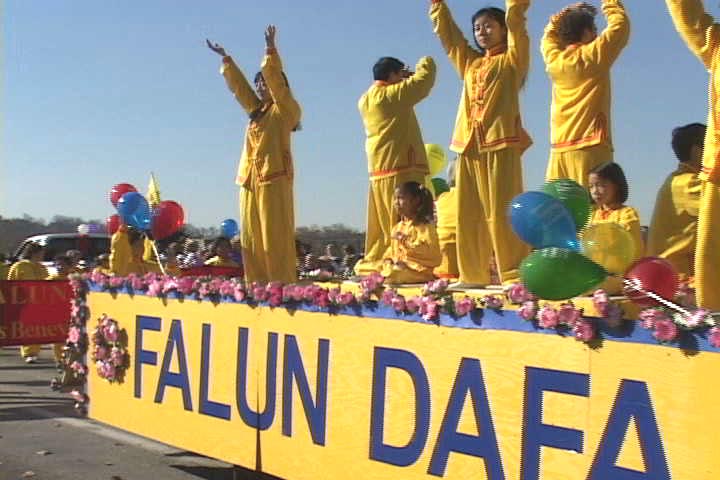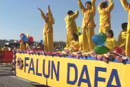 加拿大法轮大法学员在凯陈那,布兰顿,莱磁芒三城市圣诞大游行。美国加州帕莎第那秋季艺术节洪法、讲真相。