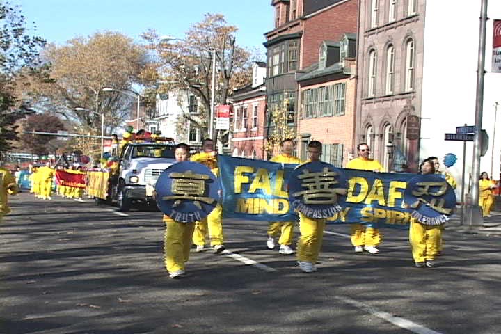 【明慧网2001年11月22日】11月17日上午,来自新泽西、DC、德拉华、彼斯堡及费城的六十多位法轮大法学员参加了在宾州首府海里斯堡举行的宾州中部最大的一次游行。这次游行的主题是“儿童看世界”,天气出奇的好,很多小弟子也特意赶来参加游行,给队伍增添了几分天真、烂漫。伴随着普度、济世音乐,学员们向热情的观众表演着优美的功法、传递着大法真相材料,再一次把千古难逢的大法带给了这里的千家万户。